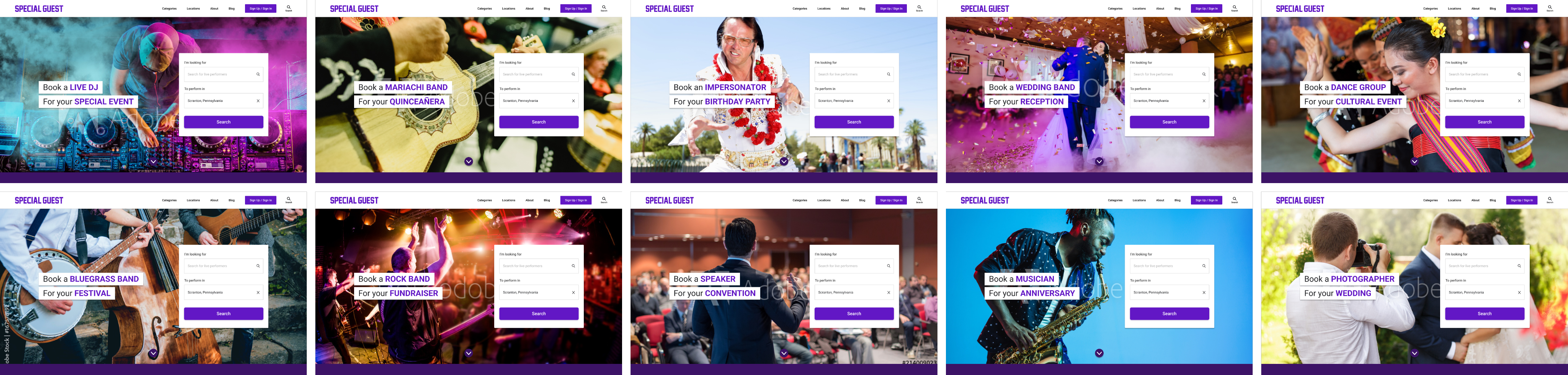 The image and copy would rotate showing users different scenarios and events for which the user could book an entertainer, rather than thinking the site was only for one kind of event.