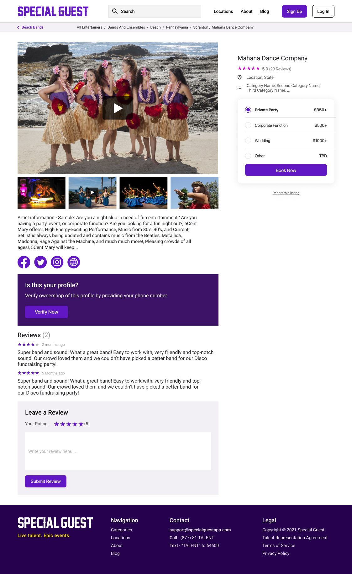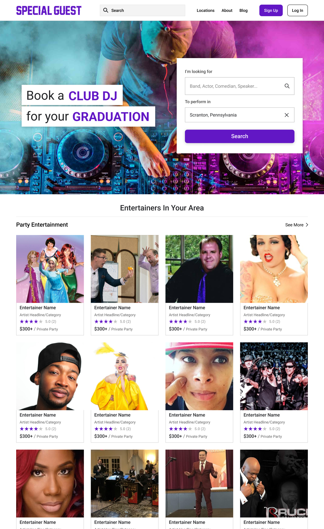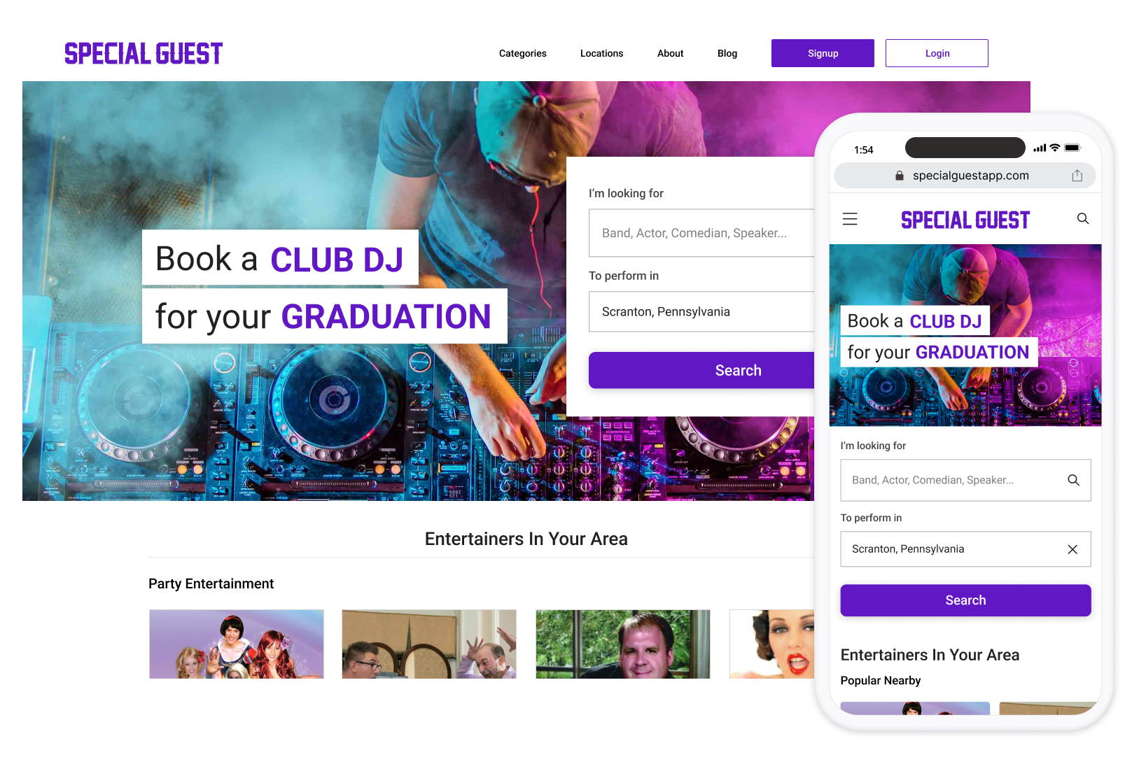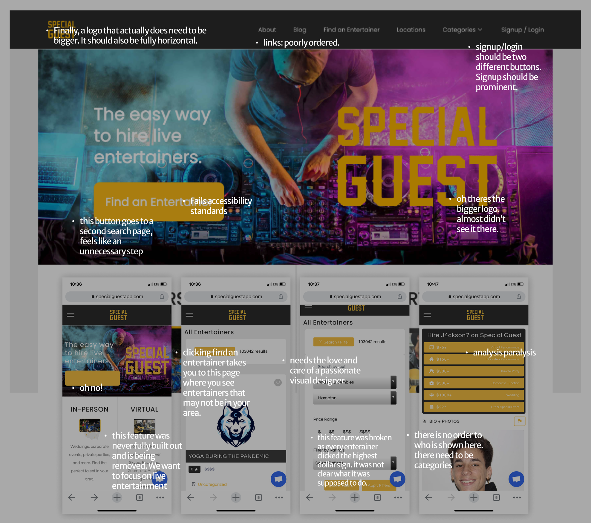 Special Guest connects performers with event organizers — think “Airbnb for entertainers.” When I joined, the product had promise but poor usability: confusing navigation, dated visuals, and a clunky mobile experience. My goal was to redesign the marketplace for clarity, trust, and delight.